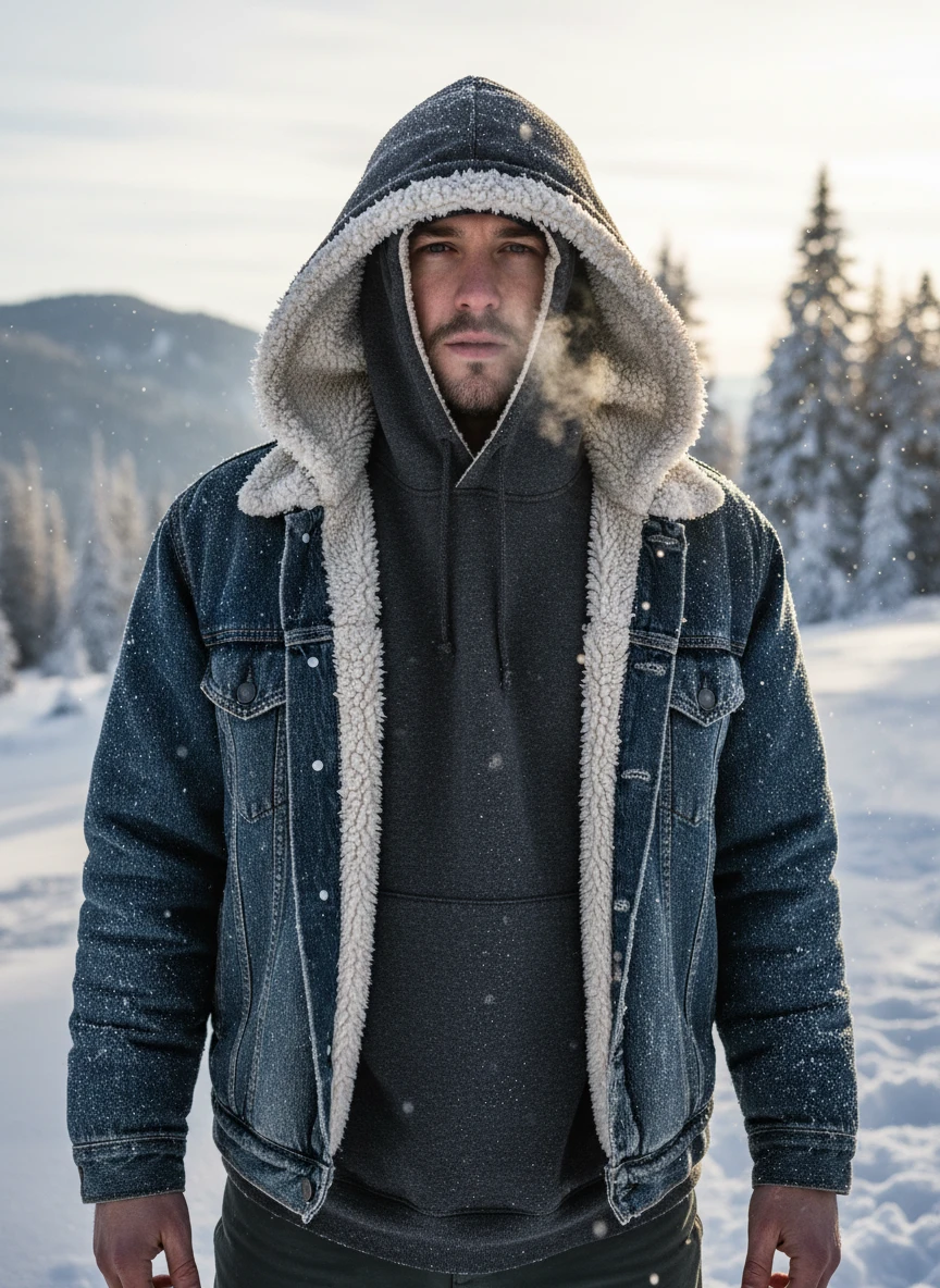 Realistic hoodie Generator showing a thick fleece-lined hoodie layered under a denim jacket in a snowy outdoor setting. Frosty air creates subtle texture contrast while the hoodie’s inner lining looks soft and plush. Realistic cold-weather lighting enhances depth and shadow without losing detail. High-resolution, natural environment, crisp detail — NEG: cartoon snow, unrealistic breath effects, plastic fabric, blur, low resolution, distorted anatomy, extra sleeves