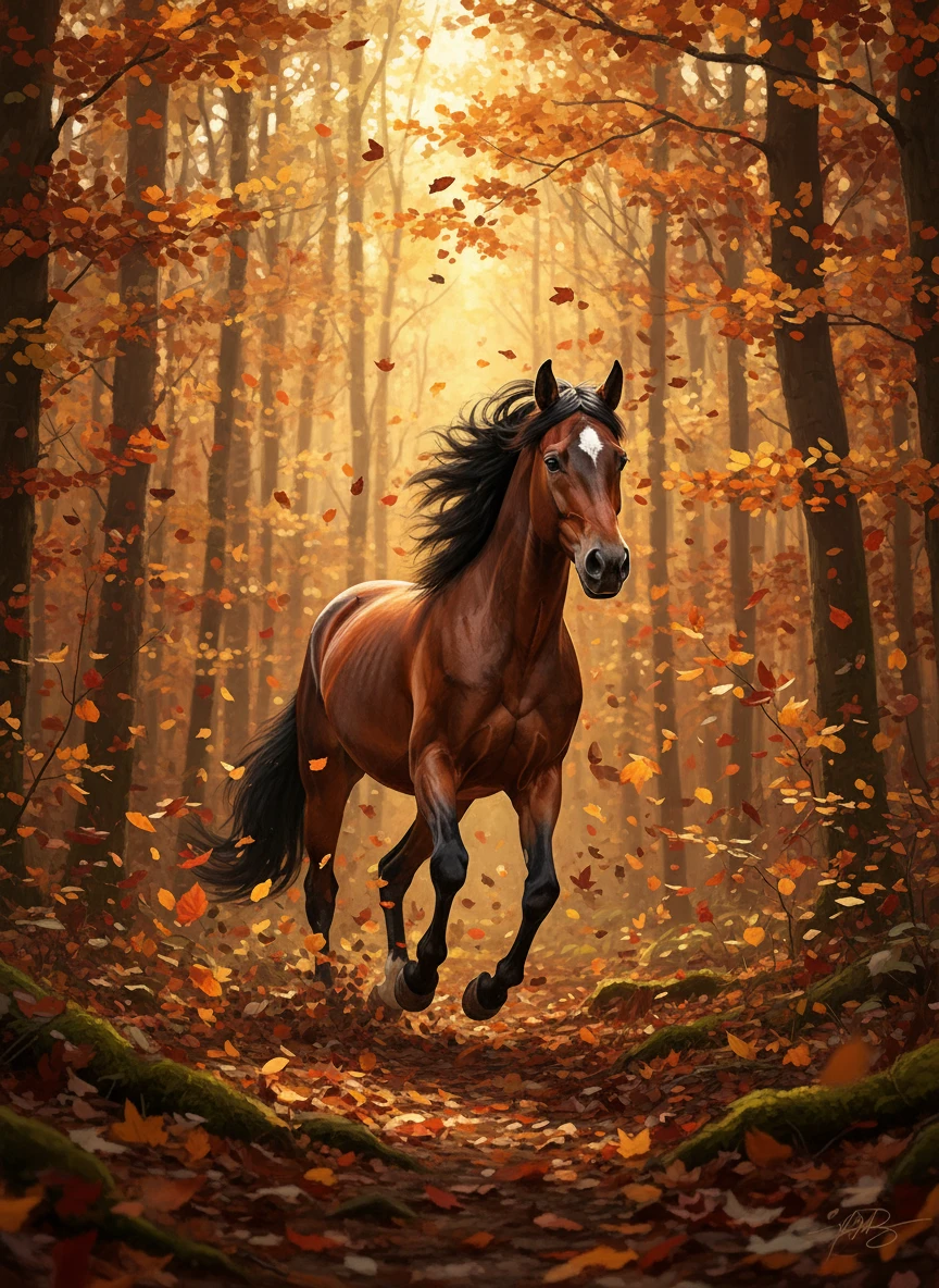 AI Horse Generator artwork featuring a brown horse running through an autumn forest filled with falling leaves. Rich earthy colors and sharp fur detail highlight the seasonal setting. The horse appears lively and anatomically accurate. Style: naturalistic, vivid, detailed NEG: oversharpening, incorrect anatomy, extra tails, dull colors, blur, sketch lines, watermark, text