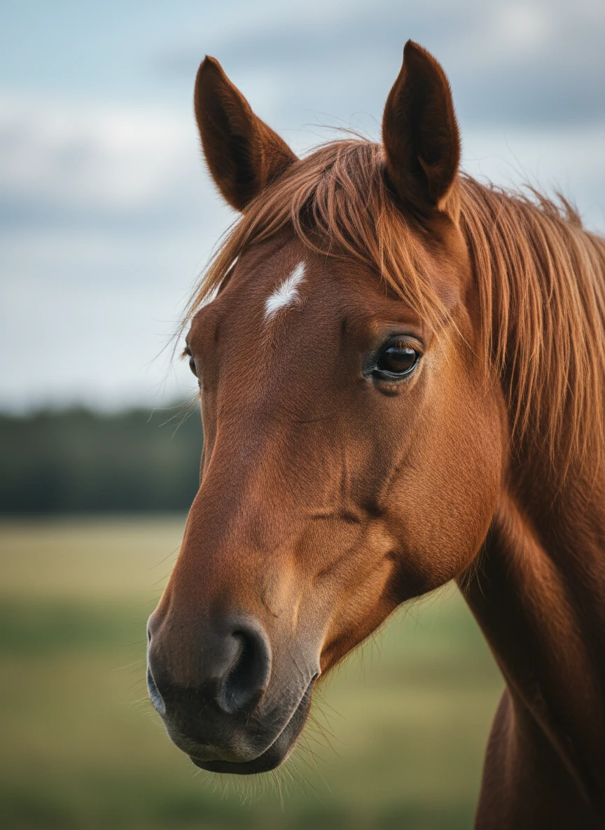 AI Horse Generator prompt featuring a close-up portrait of a horse’s head, focusing on eyes, mane, and facial texture. Fine details like hair strands and skin folds are clearly visible. The background is softly blurred to emphasize realism. Style: portrait, hyper-detailed, photorealistic