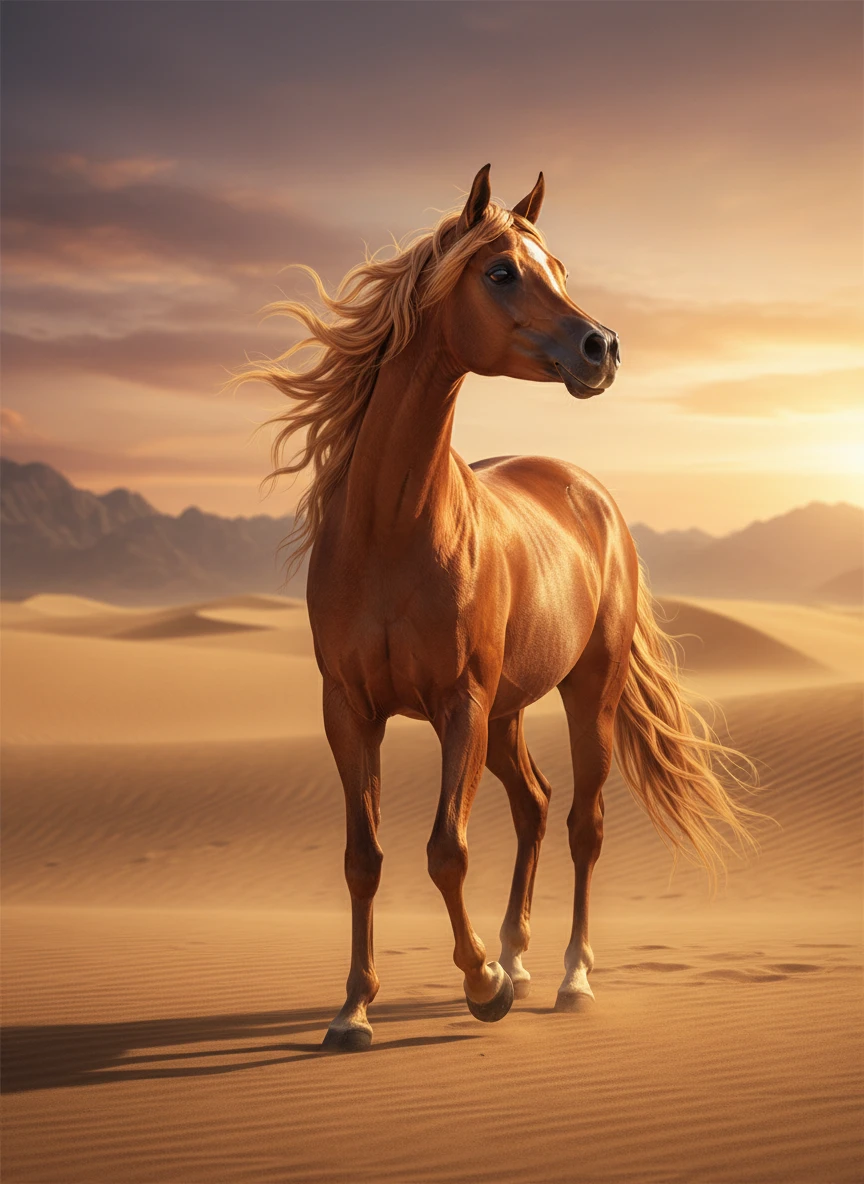 AI Horse Generator prompt depicting a majestic Arabian horse standing in golden desert light, its mane flowing in the wind with fine muscle definition and elegant posture. The scene emphasizes realism, natural anatomy, and expressive eyes. Soft shadows and warm tones enhance depth and detail. Style: realistic, cinematic, detailed NEG: blurry, extra legs, deformed anatomy, low resolution, cartoon, watermark, text, oversaturated
