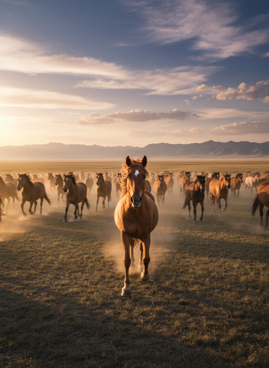 AI Horse Generator depiction of a wild mustang herd running across open plains under a wide sky. One central horse is in sharp focus while others fade slightly into the background. The scene conveys freedom and scale. Style: cinematic, wide-angle, realistic NEG: crowd clutter, duplicated horses, haze overload, blur, low resolution, cartoon style, watermark, text