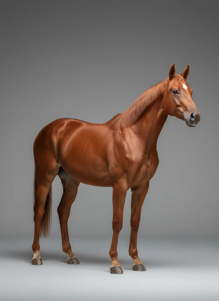 AI Horse Generator image of a chestnut horse in a studio-like neutral background, posed in profile for clarity. Lighting is even and soft, highlighting coat texture and muscle structure. Designed for clean, high-detail presentation. Style: studio, photorealistic, clean NEG: harsh shadows, background clutter, anatomy errors, blur, noise, painterly style, logo, text