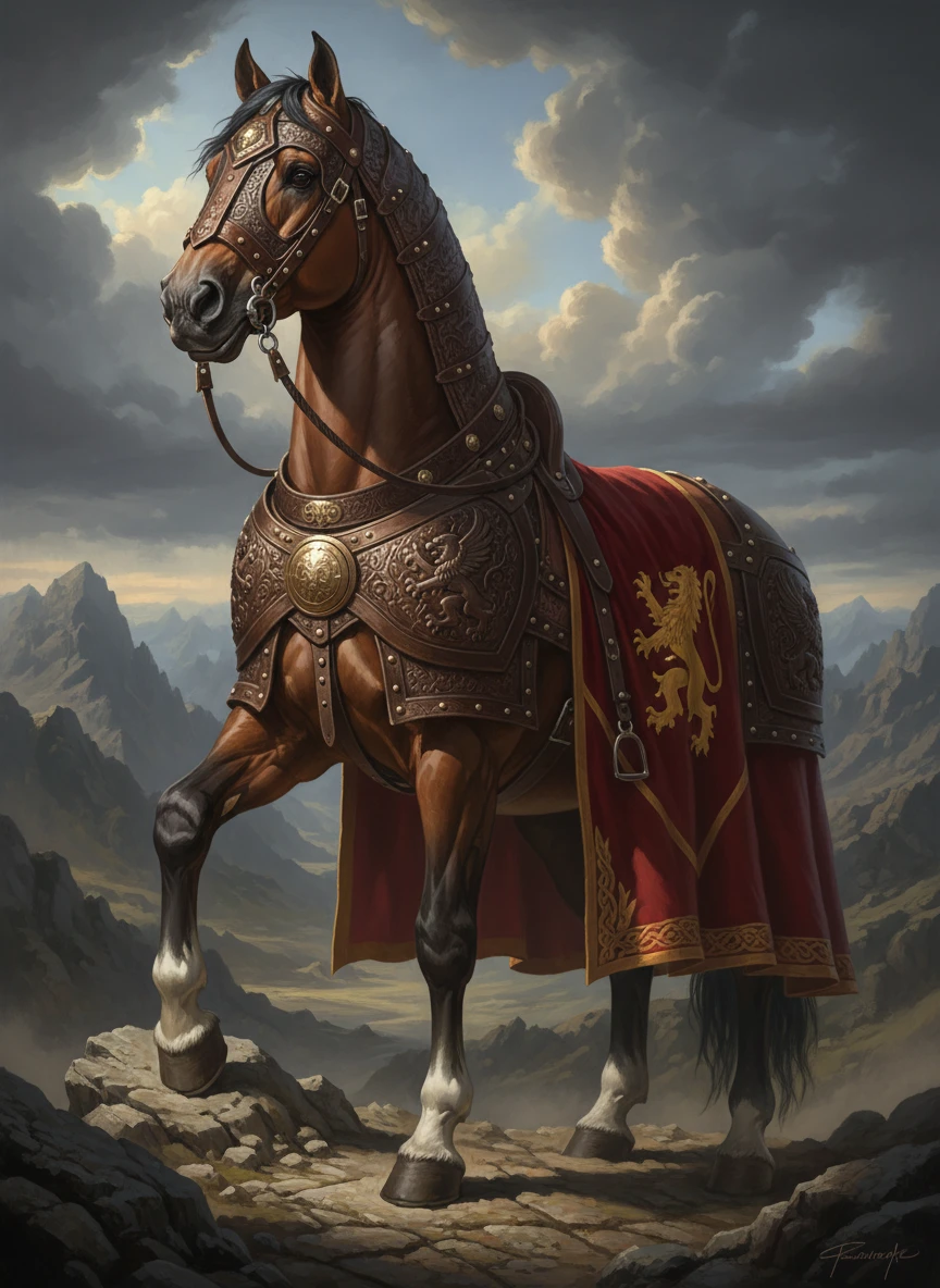 AI Horse Generator prompt of a muscular war horse in medieval-style tack, standing confidently on rocky terrain. The horse remains the focus, with realistic leather textures and strong lighting contrast. The mood is bold and heroic. Style: epic, realistic, dramatic NEG: fantasy wings, rider focus, glowing eyes, distorted proportions, blur, low detail, logo, text