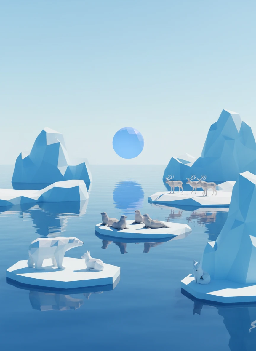 Low Poly Creator depiction of an arctic environment with low-poly animals and ice formations. Cool blues and whites dominate the palette with sharp, faceted shapes. The scene feels clean, stylized, and serene. Style tags: low-poly, wildlife, cold palette, stylized NEG: fur detail, photoreal ice, grain, blur, shadows noise, text, watermark