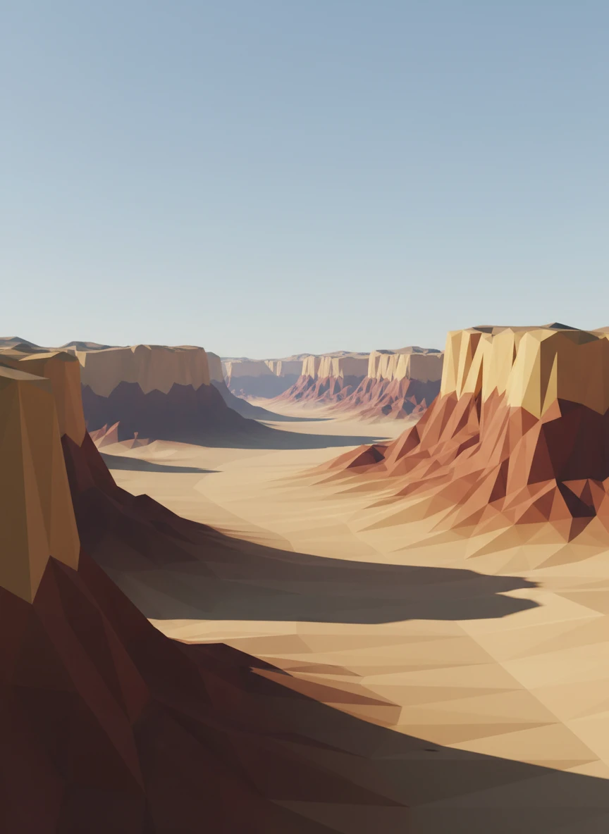 Low Poly Creator environment showing a vast desert canyon with layered polygon cliffs. Warm earth tones and sharp edges define the terrain without fine textures. A clear sky and strong silhouettes create visual impact. Style tags: low-poly, landscape, cinematic, minimal NEG: photoreal textures, erosion detail, noise, blur, lens effects, text, watermark