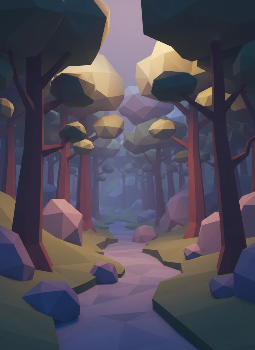 Low Poly Creator fantasy forest made of angular trees, rocks, and terrain pieces. Soft lighting and limited color palettes give the scene a storybook feel. Everything is simplified into clear polygonal forms with visible facets. Style tags: low-poly, fantasy, stylized, soft lighting NEG: realistic bark, foliage detail, grain, blur, overcomplex shapes, text, watermark