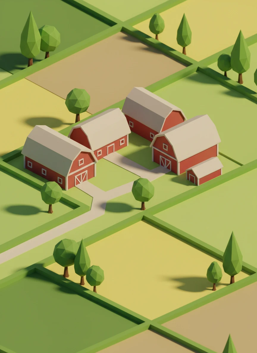 Low Poly Creator rural farm scene with barns, fields, and trees in geometric form. Patchwork fields are represented by simple colored planes. The overall mood is calm, friendly, and minimal. Style tags: low-poly, countryside, isometric, simple NEG: realistic crops, texture noise, blur, depth-of-field, text, watermark