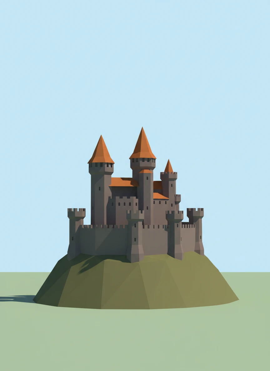 Low Poly Creator medieval castle built from angular towers and walls. The structure sits on a simple hill with flat shading and clear geometry. Colors are muted to maintain a classic, stylized look. Style tags: low-poly, medieval, geometric, minimal NEG: stone texture detail, realism, noise, blur, complex lighting, text, watermark