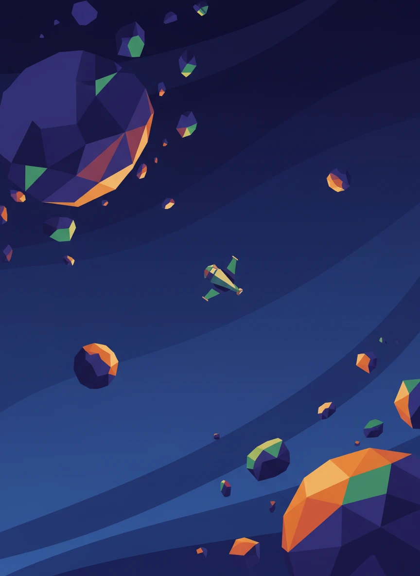 Low Poly Creator space illustration featuring planets, asteroids, and a small spaceship built from polygons. Colors are bold and flat, with simple lighting to separate shapes. The background is clean and uncluttered for clarity. Style tags: low-poly, sci-fi, stylized, clean NEG: realistic stars, glow overload, noise, blur, complex reflections, text, watermark