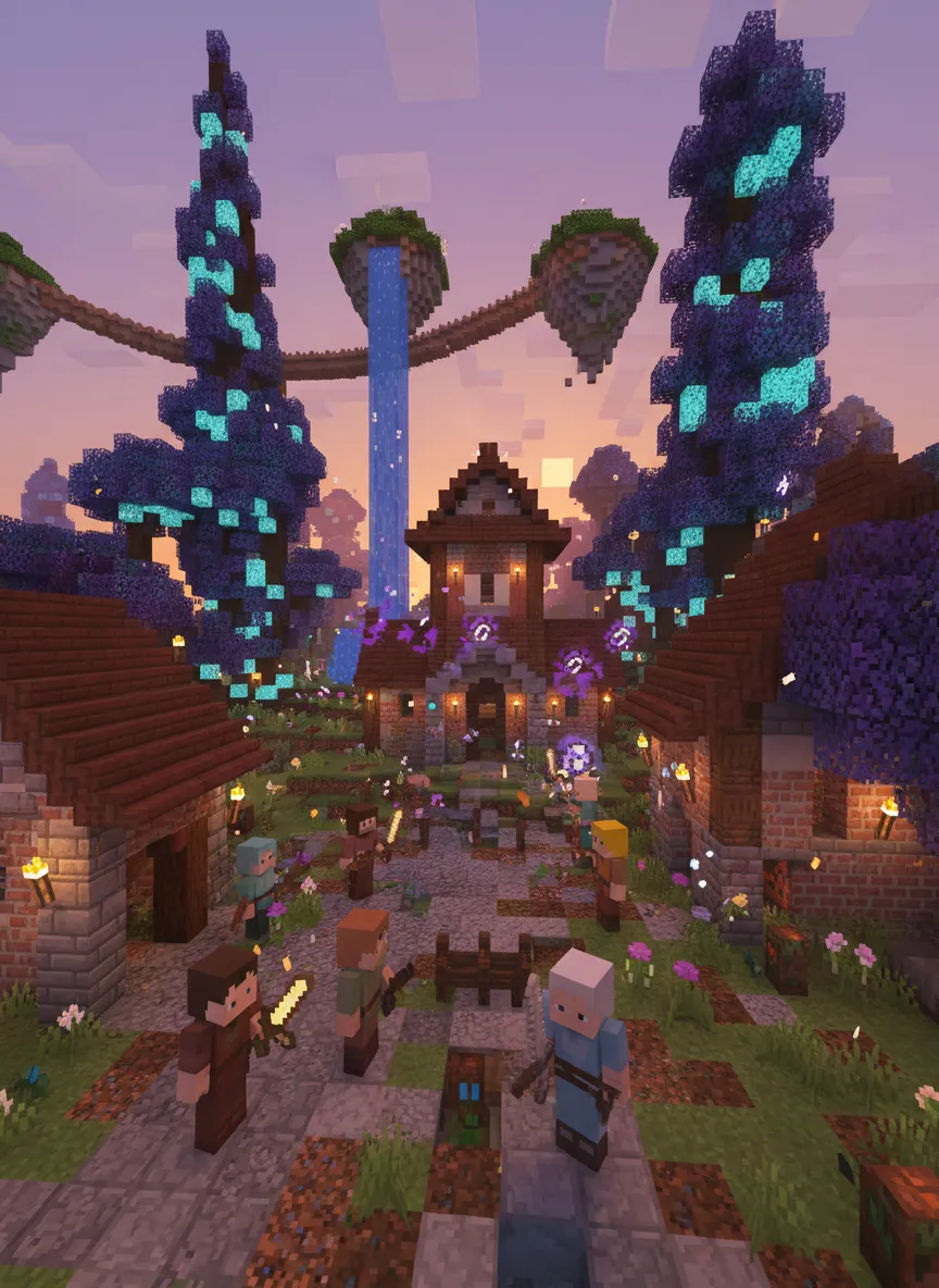 Transform the uploaded image into a fully Minecraft-style 3D voxel render set in a magical fantasy world. Recreate people, creatures, and buildings using Minecraft’s block geometry with 16×16 textures. Convert characters into blocky heroes with pixel-mapped clothing and simplified facial expressions. Add glowing torches, mystical trees, floating islands, and enchanted elements. Lighting: warm sunset with soft voxel shadows and ambient glow. Camera: cinematic third-person angle emphasizing depth and scale. Mood: epic, adventurous, playful, as if a Minecraft fantasy scene came alive.