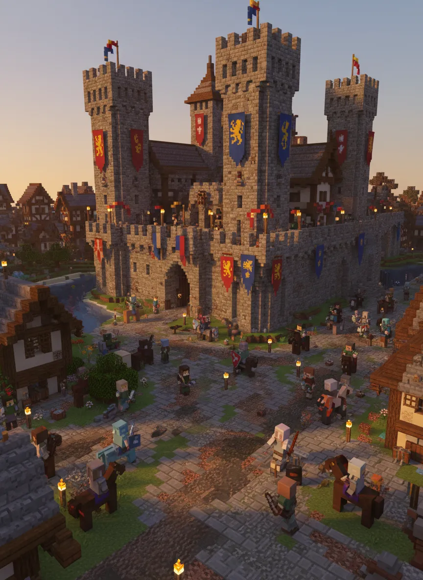 Convert the uploaded image into a Minecraft-style 3D voxel medieval scene. Recreate all people, horses, banners, buildings, and objects as cubes with 16×16 textures. Characters wear blocky armor or medieval clothing with pixel-mapped details. Include castles, cobblestone streets, and torches. Lighting: warm golden sunlight with voxel shadows and ambient occlusion. Camera: cinematic third-person perspective highlighting scale and depth. Mood: epic, immersive, nostalgic Minecraft medieval adventure.