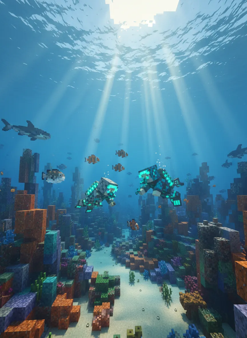 Render the uploaded image as a Minecraft-style 3D voxel scene underwater. Convert all objects, characters, and marine life into cubes with pixel textures. Characters wear blocky diving outfits or fantasy underwater gear. Include coral reefs, blocky fish, and sun rays filtering through water. Lighting: soft blue ambient with voxel shadows and realistic underwater depth. Camera: cinematic angle emphasizing depth and 3D underwater space. Mood: immersive, playful, exploratory Minecraft ocean adventure.