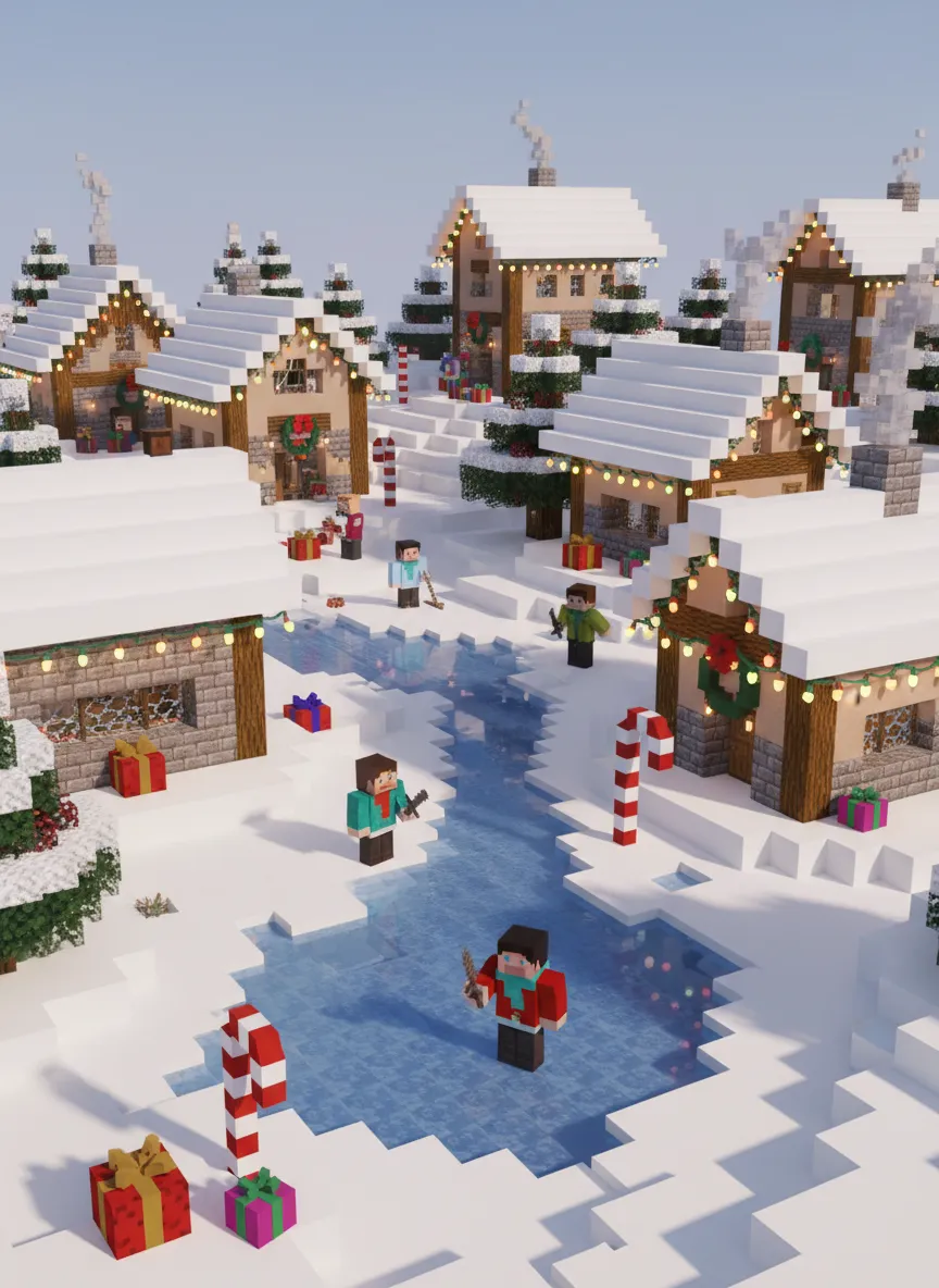 Transform the uploaded image into a Minecraft-style 3D voxel winter scene. All elements — people, animals, trees, buildings — are recreated as cubes with snowy textures. Characters wear blocky winter clothing with pixel details. Include snow-covered roofs, icy lakes, and festive decorations. Lighting: soft winter daylight or warm holiday glow with voxel shadows. Camera: cinematic perspective capturing snow depth and environment. Mood: cozy, playful, festive Minecraft winter wonderland.