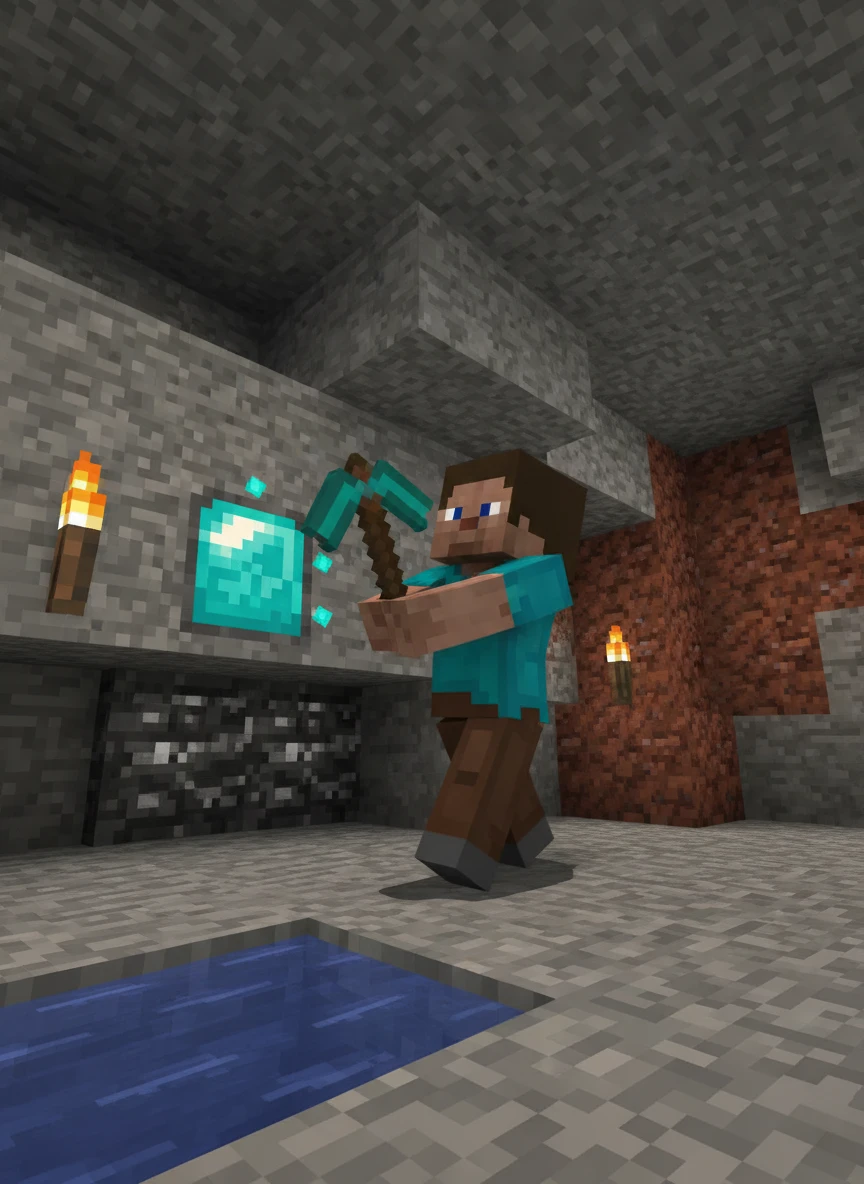 Block style Steve mining diamonds inside underground cave with torches