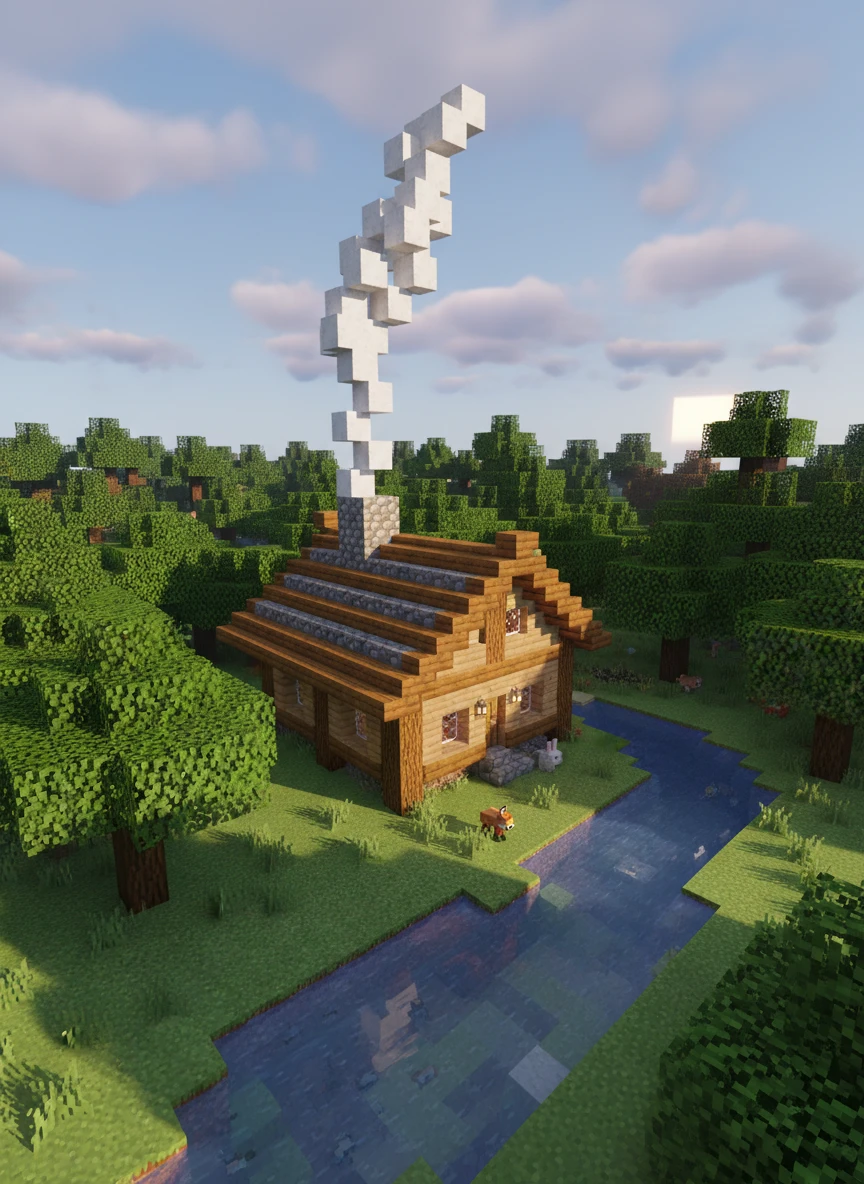 Blocky Minecraft forest cabin built from oak logs with chimney smoke