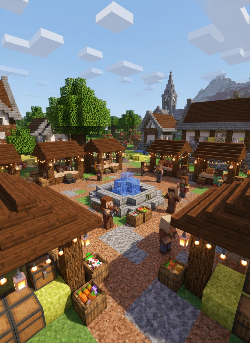 Block Minecraft villager market square with wooden stalls lanterns daylight