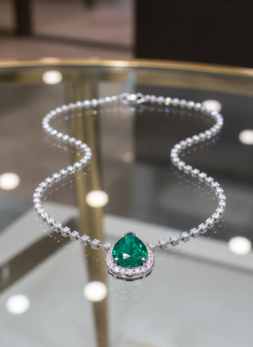 Realistic Necklace Generator presenting an elegant emerald drop necklace displayed on a reflective glass surface. The deep green pear-shaped emerald is surrounded by small pavé diamonds set in polished white gold, photographed in high-end jewelry advertising style. Balanced lighting highlights gemstone depth, precise facets, and realistic shadow gradients. ultra-detailed, luxury jewelry, sharp focus, realistic reflections — NEG: plastic texture, dull colors, low detail, CGI look, overexposed, warped chain