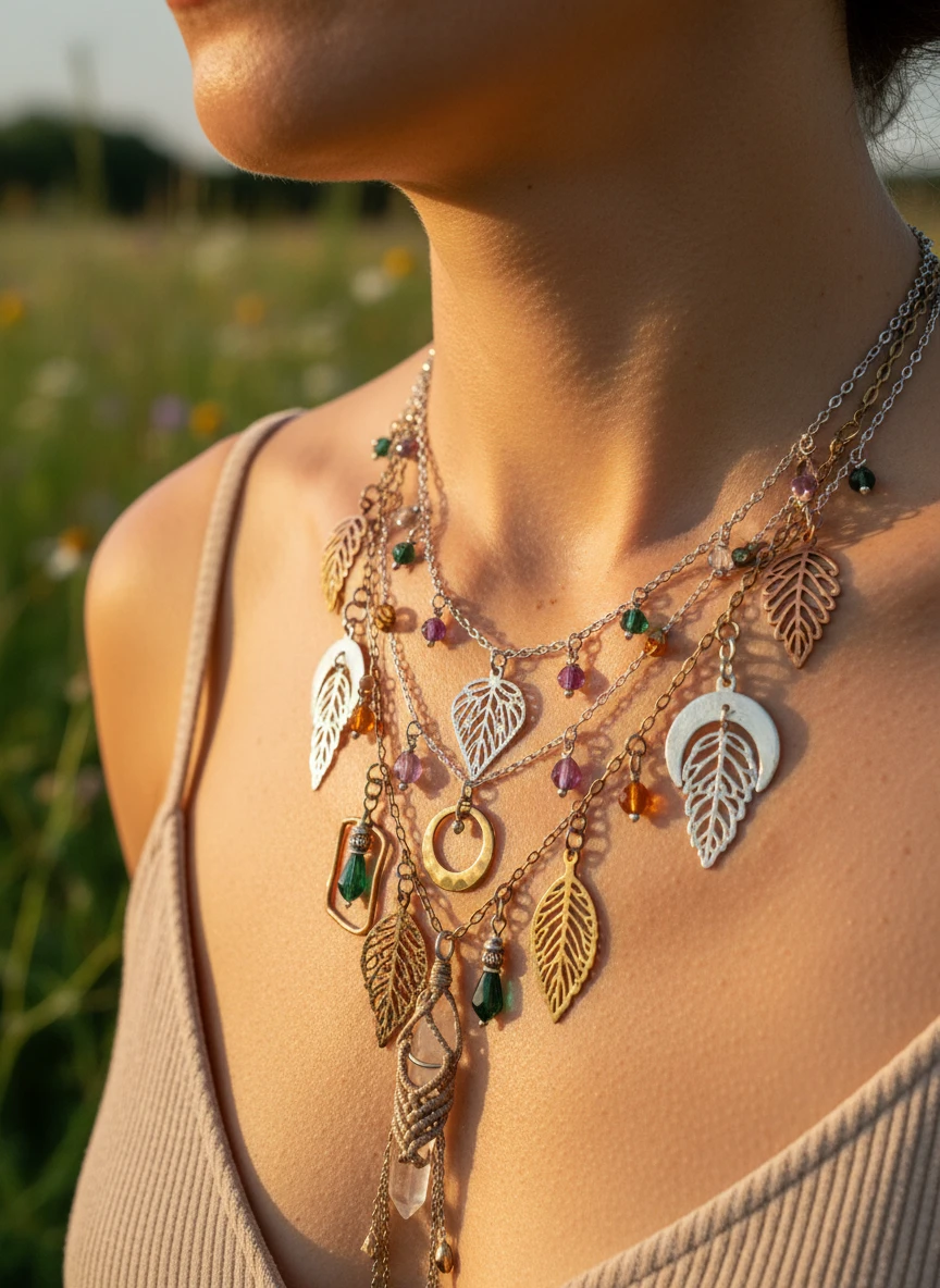 Realistic Necklace Generator depicting a layered bohemian-style necklace worn outdoors in golden hour sunlight. Mixed metal pendants and small gemstones hang at varying lengths, with authentic skin texture and natural sunlight reflections enhancing realism. The background shows soft bokeh greenery, maintaining focus on intricate chain details. golden hour, lifestyle realism, textured metals, depth of field — NEG: flat colors, stiff pose, distorted perspective, noisy background, overprocessed skin, unrealistic glow