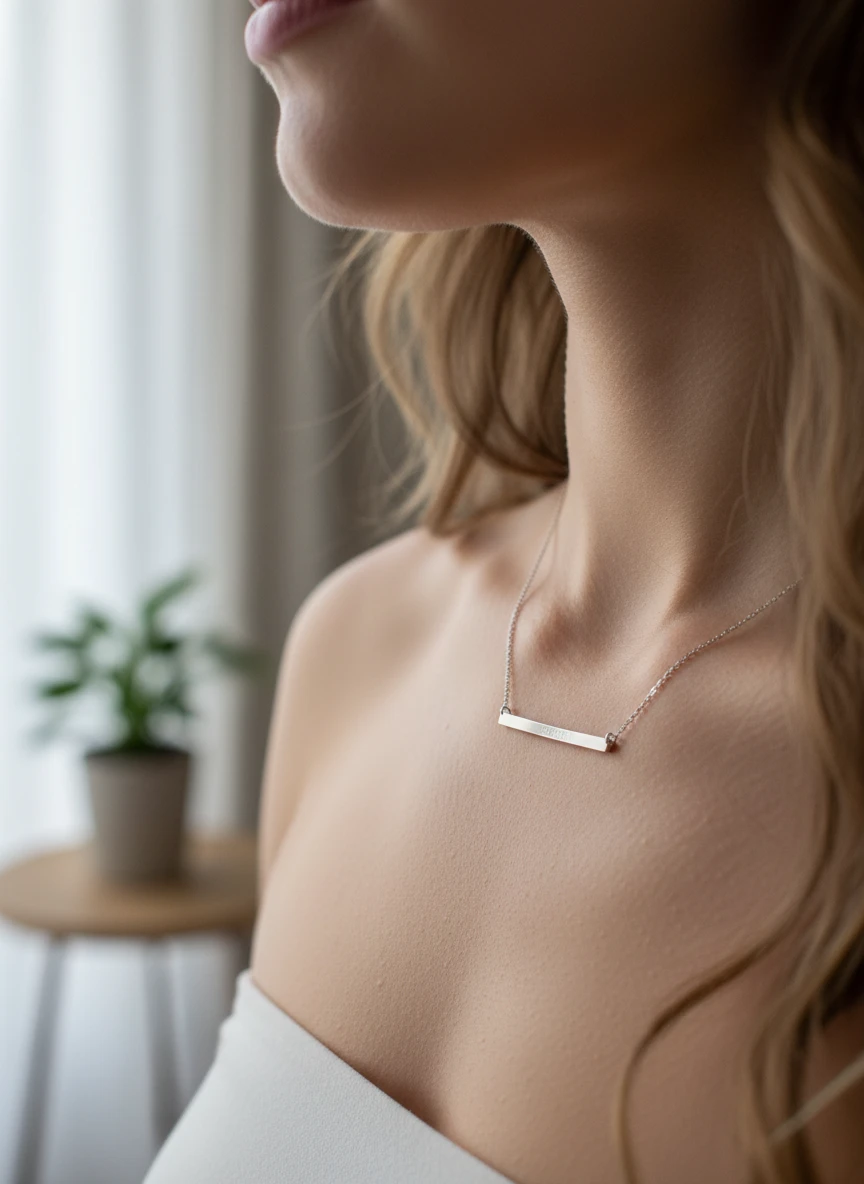Realistic Necklace Generator displaying a minimalist silver bar necklace worn naturally on a model’s collarbone. The sleek sterling silver bar reflects soft daylight from a window, producing realistic skin tones and subtle metal shine. Lifestyle photography style with shallow depth of field keeps focus sharp on the necklace while the background remains gently blurred. natural light, lifestyle realism, clean aesthetic, shallow depth — NEG: heavy makeup focus, artificial glow, distorted anatomy, noisy image, oversaturated, unrealistic shine