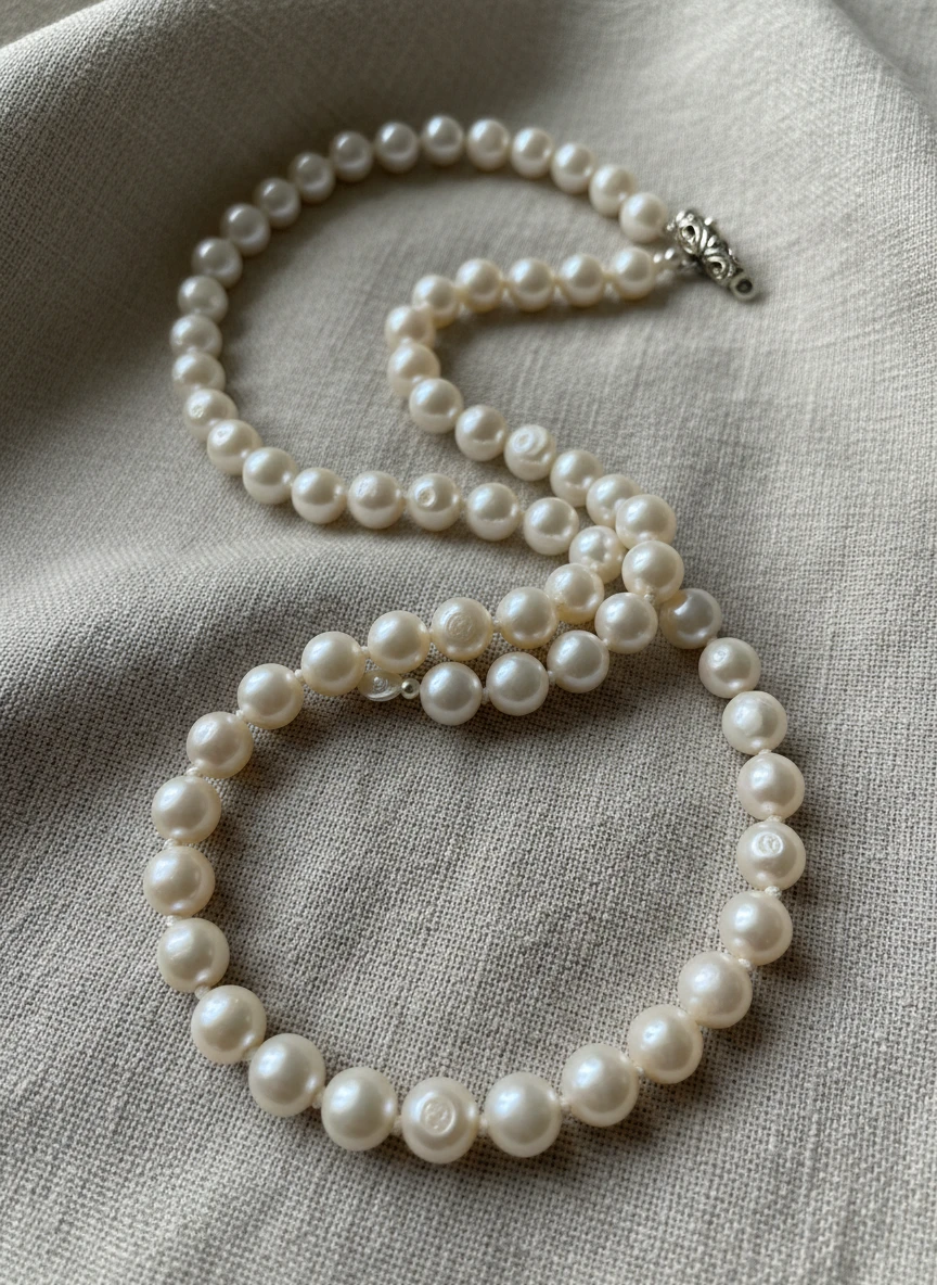 Realistic Necklace Generator presenting a classic white pearl strand necklace arranged gracefully on soft beige linen fabric. Each pearl shows subtle natural imperfections, gentle luster, and authentic light reflections under diffused daylight. The composition feels refined and timeless with accurate scale and realistic texture rendering. soft lighting, timeless elegance, texture detail, natural tones — NEG: perfectly uniform pearls, harsh shadows, overexposed highlights, low resolution, artificial shine, CGI effect