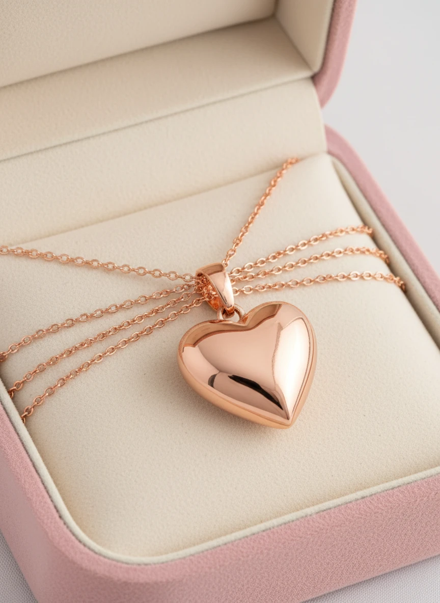 Realistic Necklace Generator featuring a romantic rose gold heart-shaped necklace placed inside a soft pastel jewelry box. The polished rose gold surface reflects ambient light naturally, with delicate chain links rendered in sharp macro detail. Gentle softbox lighting ensures balanced highlights and realistic metallic warmth. romantic aesthetic, macro clarity, soft shadows, photorealistic metal — NEG: harsh reflections, unrealistic proportions, blurred edges, cartoon finish, uneven lighting, artificial texture