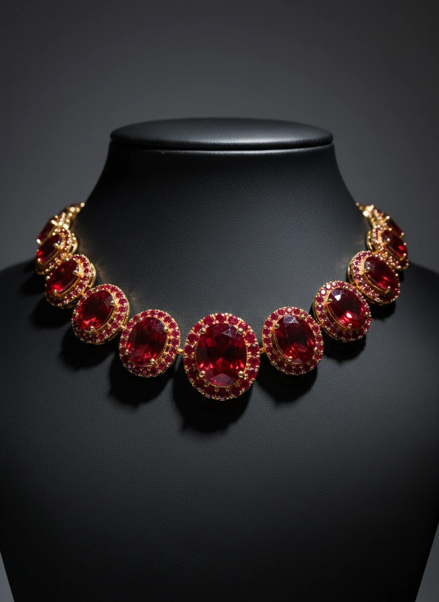 Realistic Necklace Generator showcasing a bold ruby choker necklace styled on a matte charcoal mannequin bust. Multiple oval-cut rubies are set in symmetrical gold settings, captured in dramatic studio lighting that enhances gemstone richness and contrast. Fine details of prongs, reflections, and shadows appear lifelike and proportional. high contrast, luxury editorial, gemstone clarity, sharp macro — NEG: faded colors, plastic look, blurry gemstones, crooked alignment, excessive glare, cartoonish
