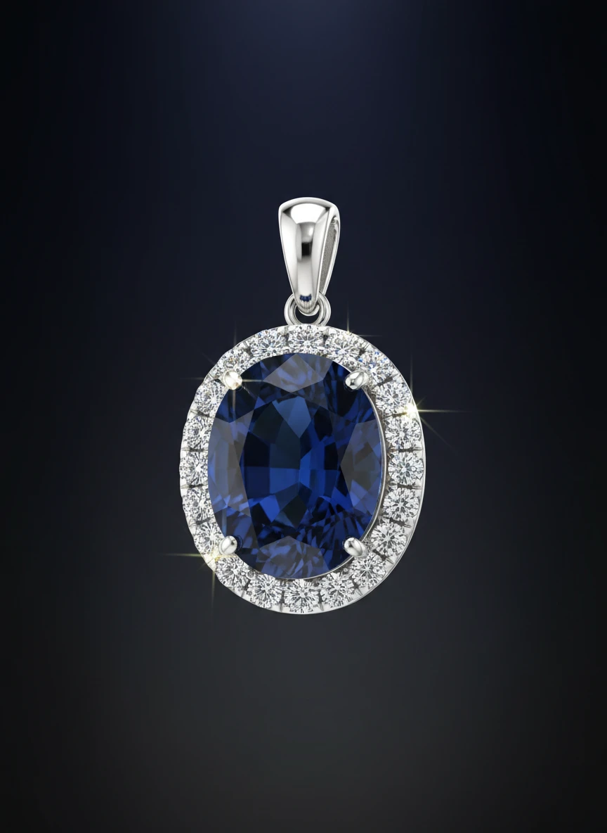 Realistic Necklace Generator highlighting a sapphire halo pendant suspended mid-air against a dark gradient backdrop. A deep blue oval sapphire is encircled by small diamonds in platinum, illuminated by controlled spotlighting to create crisp reflections and depth. Ultra-realistic gemstone refraction and detailed metal craftsmanship are clearly visible. dramatic lighting, gemstone realism, premium jewelry, high detail — NEG: flat background lighting, dull gemstone, distorted chain links, pixelated edges, fake reflections, oversaturated blue