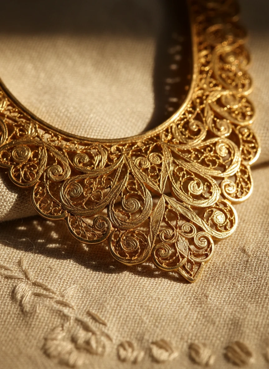 Realistic Necklace Generator featuring a vintage-inspired gold filigree necklace placed on antique silk fabric. Intricate handcrafted patterns in warm 22k gold are captured with macro-level detail, emphasizing texture, engravings, and subtle patina. Warm directional lighting creates natural depth and elegant highlights on the detailed metalwork. macro realism, warm tones, antique luxury, fine texture — NEG: modern minimalism, blurry edges, flat shadows, low resolution, cartoon style, uneven symmetry