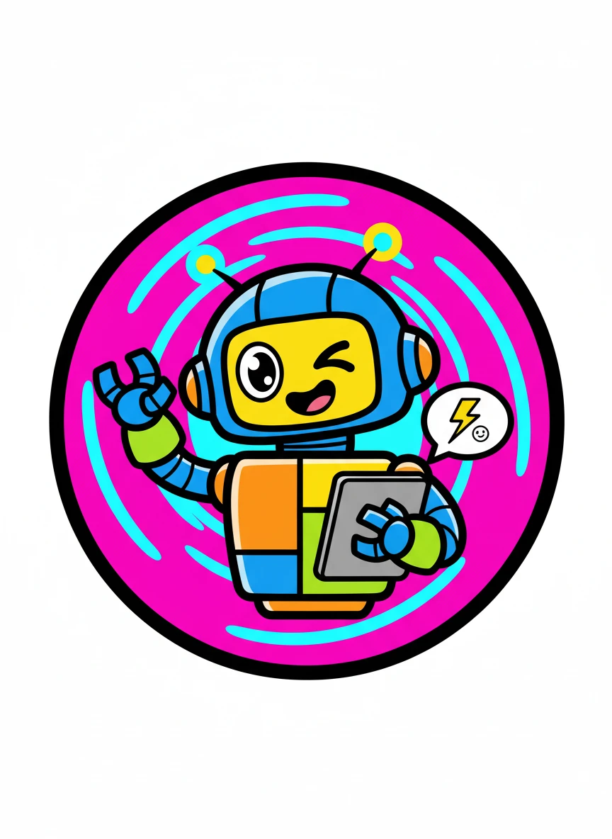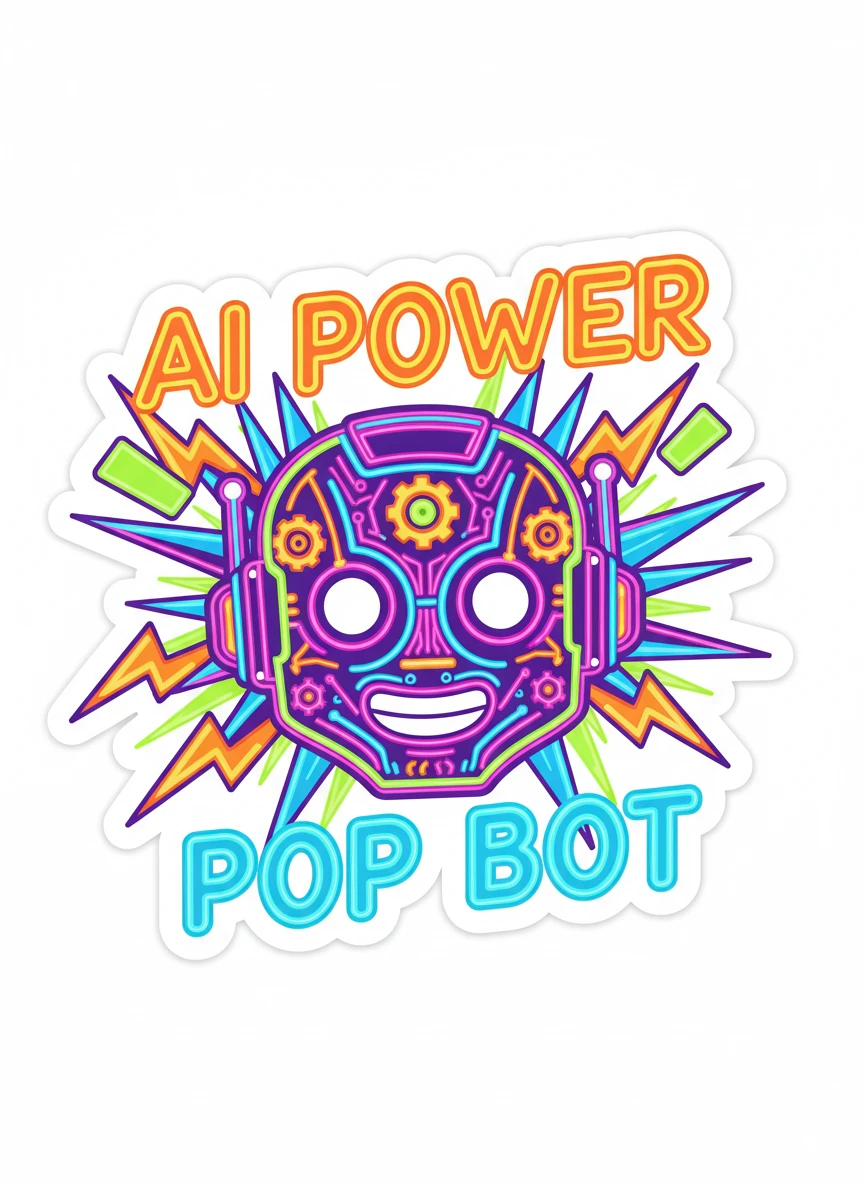 Create a neon-pop style sticker using the AI Sticker Generator, with vibrant glowing colors and exaggerated cartoon shapes. The design should pop visually while remaining flat and sticker-ready. Balance the brightness with a strong white outline. neon, vibrant, pop art, bold — NEG: dark muddy colors, photoreal lighting, background textures, blur, color banding