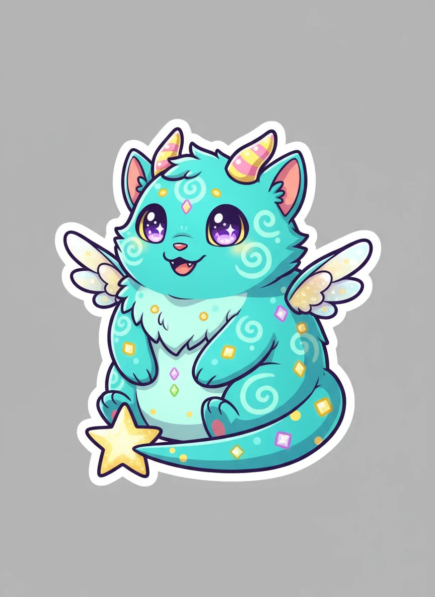 Create a cute fantasy creature sticker using the AI Sticker Generator, blending magical elements with a friendly cartoon style. Use bright colors, simple shapes, and a compact pose to ensure sticker clarity. Include a clean die-cut outline on a transparent background. fantasy, cute creature, cartoon, sticker — NEG: dark realism, complex armor, background landscape, gritty texture, blur