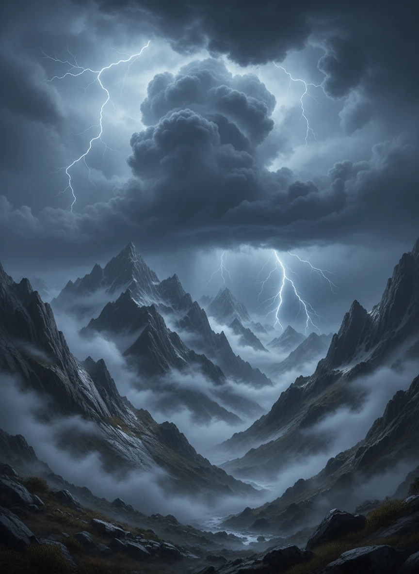 A mountain range under siege visualized through AI Thunderstorm Generator, with lightning illuminating jagged peaks and rolling fog. Rain clouds cling to steep slopes while thunderheads tower overhead. The mood is cold, powerful, and isolated. epic realism, alpine storm, moody atmosphere — NEG: tropical elements, flat lighting, soft focus, fantasy glow, people, structures