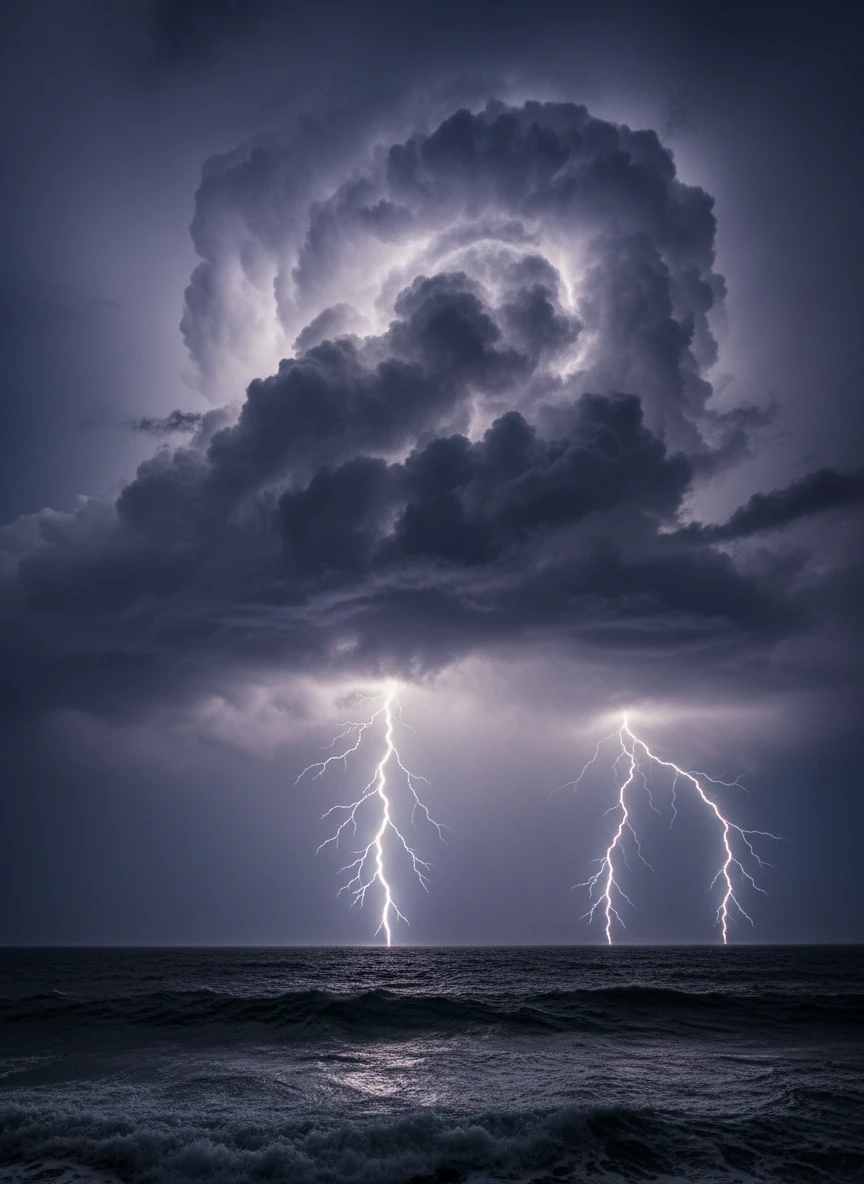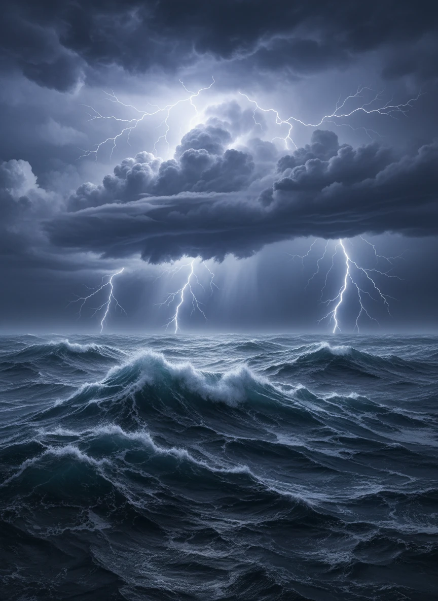 A vast ocean thunderstorm created with AI Thunderstorm Generator, showing towering waves beneath a lightning-laced sky. Layered clouds and distant rain curtains add scale and depth. The sea feels powerful and untamed. marine realism, dramatic weather, high contrast — NEG: calm water, pastel sky, low detail, illustration style, ships, text