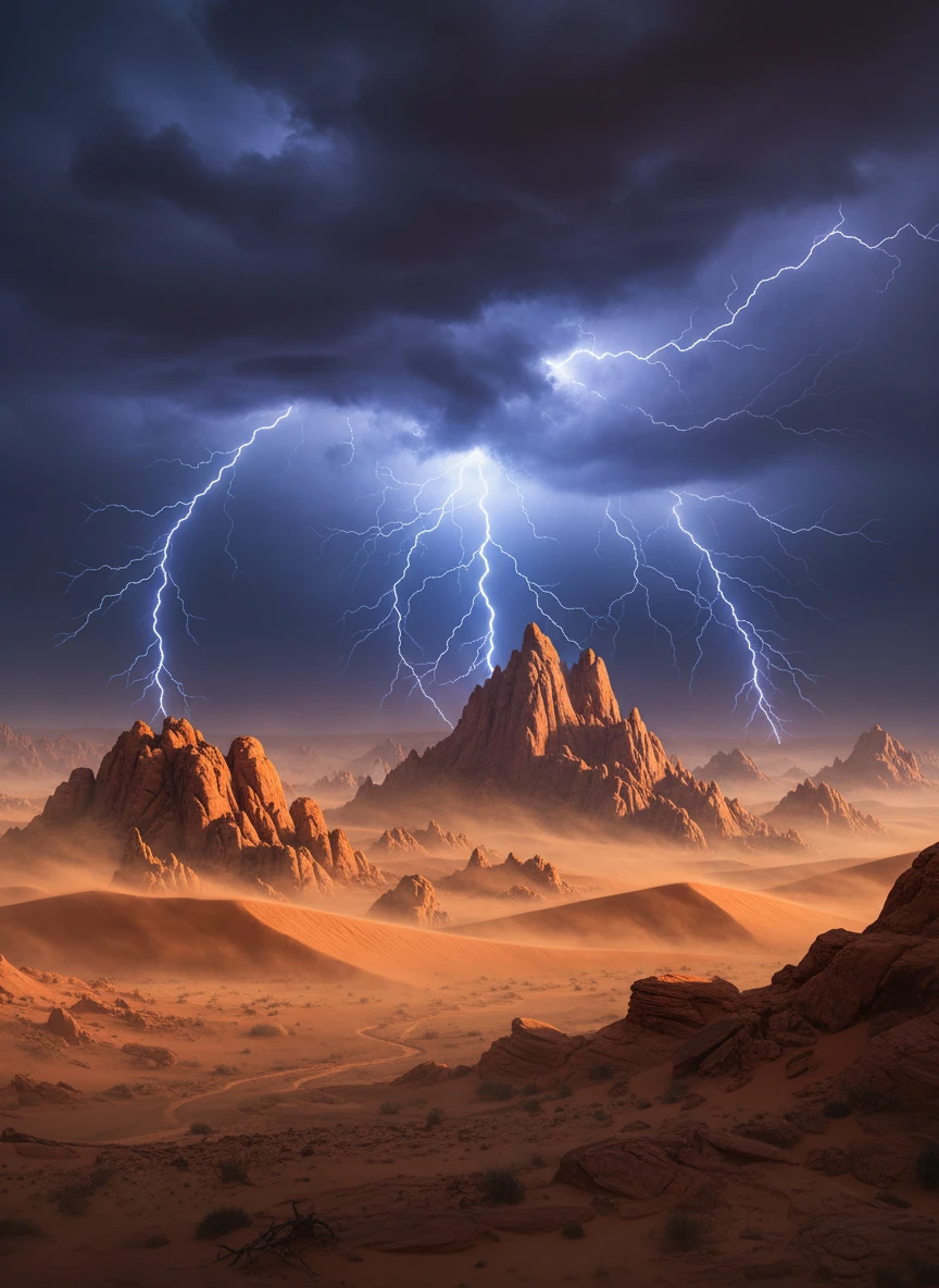A cinematic desert thunderstorm scene produced with AI Thunderstorm Generator, where lightning cracks above red rock formations and wind-driven sand. Dark clouds sharply contrast warm earth tones below. The air feels dry yet electrically charged. cinematic landscape, dramatic contrast, epic scale — NEG: snow, lush vegetation, sci-fi elements, low detail, haze, cartoon style