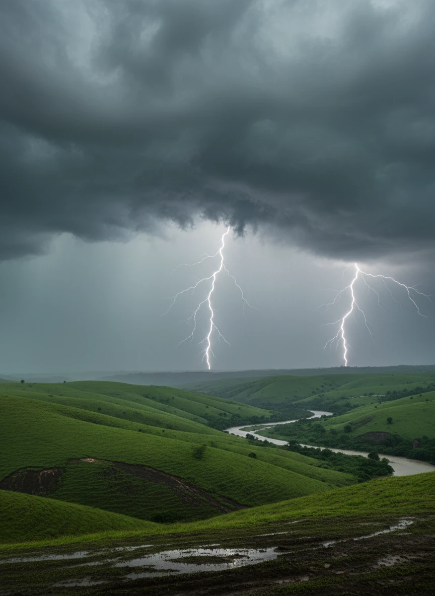 A monsoon-inspired landscape visualized by AI Thunderstorm Generator, with heavy rain, low clouds, and frequent lightning over rolling hills. Dense atmosphere conveys humidity and motion without exaggeration. The scene feels grounded and realistic. environmental realism, monsoon storm, cinematic mood — NEG: snowstorm, desert dunes, fantasy lighting, oversharpening, cartoon look, people