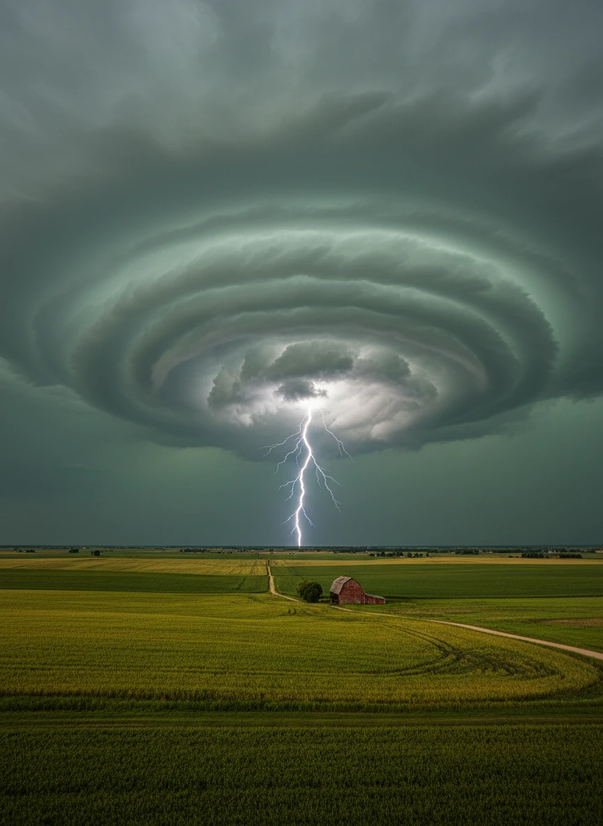 A wide farmland landscape rendered by AI Thunderstorm Generator, featuring a rotating supercell beneath a greenish-gray sky. A single lightning strike illuminates fields and a lone barn near the horizon. Calm land contrasts with violent clouds above. natural realism, wide angle, atmospheric — NEG: unrealistic colors, fantasy clouds, blur, overexposure, painterly, animals, text