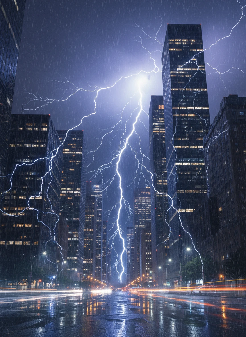 A dense city skyline at night created using AI Thunderstorm Generator, with lightning threading between skyscrapers and reflecting on rain-soaked streets. Wet glass and glowing windows add depth and scale to the scene. The atmosphere feels intense yet realistic. urban realism, nightscape, dramatic lighting — NEG: distorted buildings, neon overload, foggy, low resolution, cartoonish, people, logos