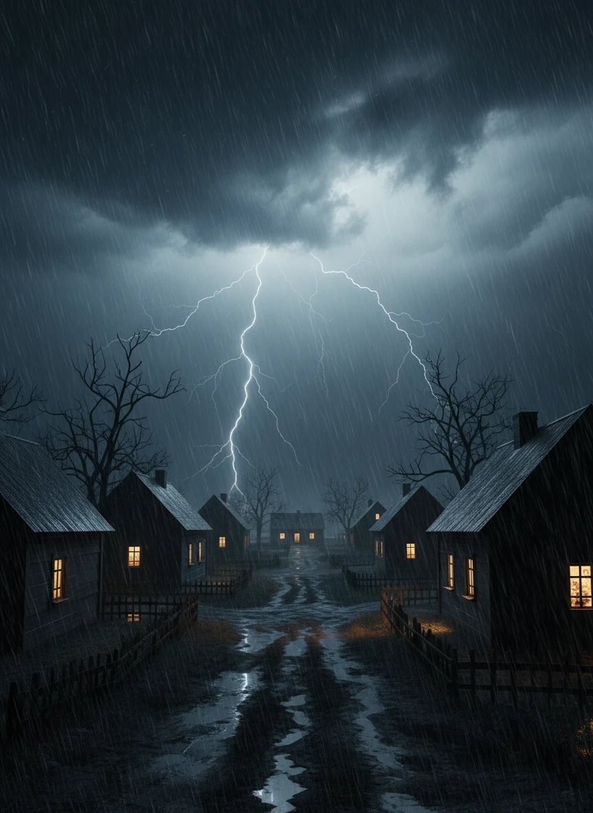 A rural village at night generated via AI Thunderstorm Generator, with lightning silhouetting rooftops and trees against heavy clouds. Warm window lights contrast cold blue-gray rain. Streaking rain adds motion and depth. moody realism, night storm, cinematic — NEG: futuristic buildings, neon lights, blur, fantasy elements, characters, watermark