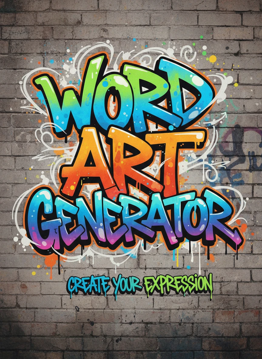 Illustrate a word art generator design with bold graffiti-style letters. The text should feel hand-sprayed, expressive, and full of attitude, set against a subtle urban wall texture. Emphasize motion and individuality. Style: graffiti, street art, expressive typography NEG: clean corporate fonts, flat colors, polished finish, blur, low detail, incorrect spelling
