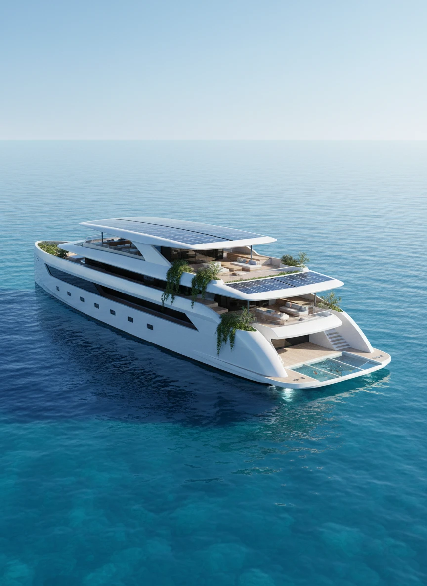 A minimalist eco-friendly yacht concept imagined by the AI Yacht Generator, powered by solar panels and hybrid propulsion. Clean lines, matte white surfaces, and integrated greenery define the design. The yacht floats in crystal-clear waters under a bright, clean sky. Sustainable design, minimalism, modern — NEG: smoke, oil spills, heavy rust, cluttered decks, unrealistic reflections, blur, watermark.