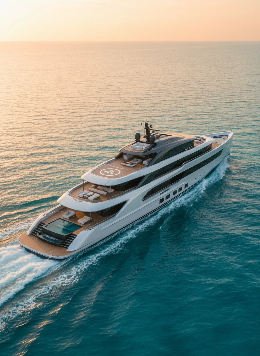 A sleek luxury superyacht cutting through calm turquoise waters, designed for elegance and speed, rendered as a flagship concept by the AI Yacht Generator. The hull features flowing white lines, expansive glass decks, and a sunlit helipad. Golden-hour lighting reflects off the water for a premium, aspirational mood. Photorealistic, luxury marine, cinematic — NEG: blur, low-res, distorted hull, extra masts, crooked horizon, watermark, text artifacts.