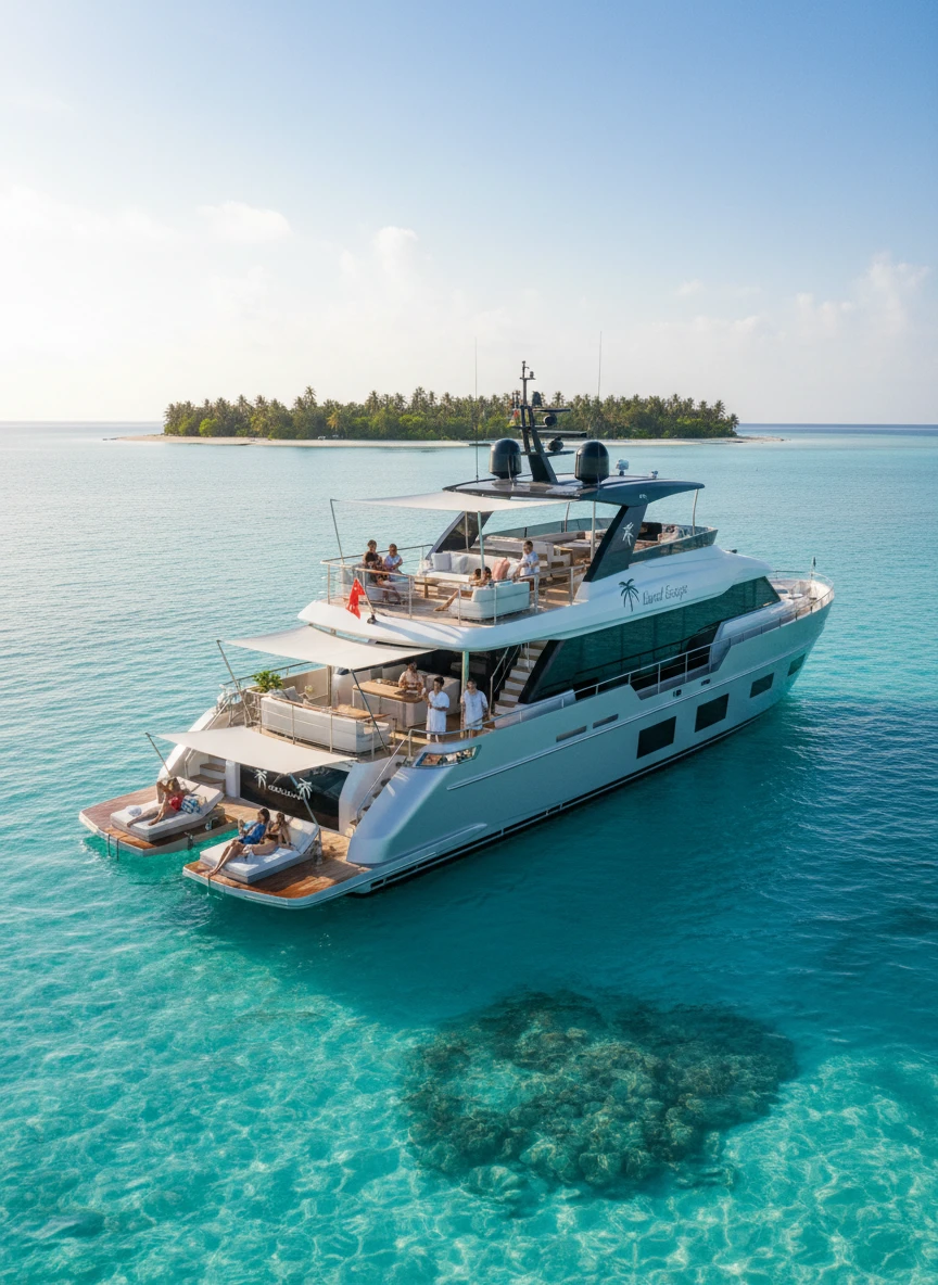 A tropical charter yacht cruising through shallow island waters, visualized by the AI Yacht Generator for vacation appeal. The yacht features wide open decks, beach clubs at the stern, and turquoise water visible below. Palm-lined islands frame the background. Travel lifestyle, tropical, bright — NEG: stormy weather, cold tones, distorted scale, cloudy water, artifacts, text, noise.