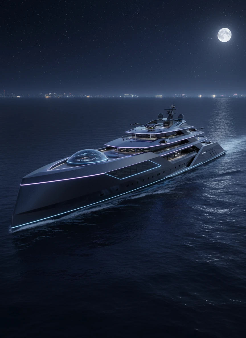 A futuristic megayacht concept created by the AI Yacht Generator, featuring sharp angular geometry and a dark carbon-fiber finish. Neon accent lighting traces the contours of the yacht as it glides through a calm night ocean. The design feels bold, experimental, and technologically advanced. Futuristic, night scene, high-contrast — NEG: soft focus, retro style, wooden textures, mismatched lighting, clutter, artifacts, text.