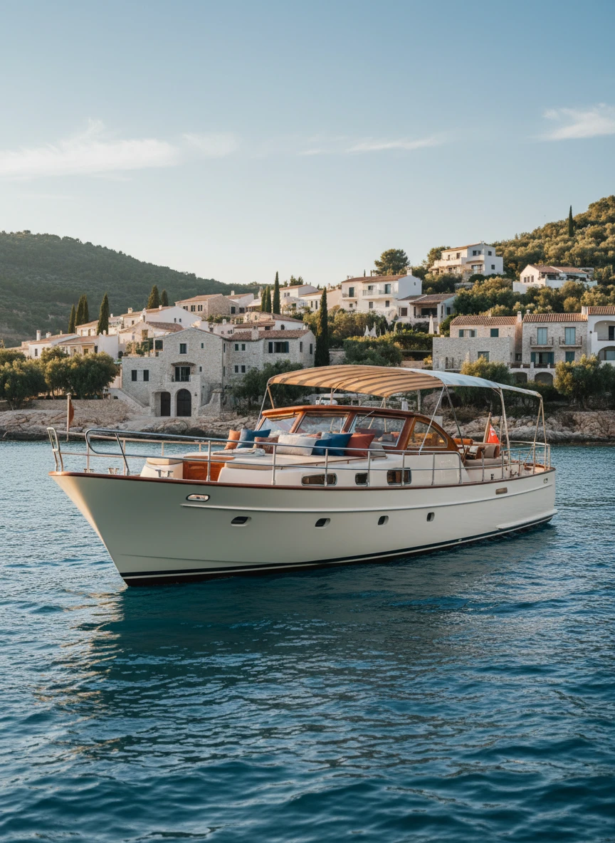 A classic Mediterranean-style yacht anchored near a coastal village, visualized by the AI Yacht Generator with timeless proportions. Polished wood decks, cream-colored hull, and elegant railings evoke old-world luxury. Warm sunlight and gentle waves create a relaxed summer atmosphere. Classic luxury, coastal, warm tones — NEG: modern skyscrapers, harsh shadows, warped rails, blurry details, extra decks, logos, grain.