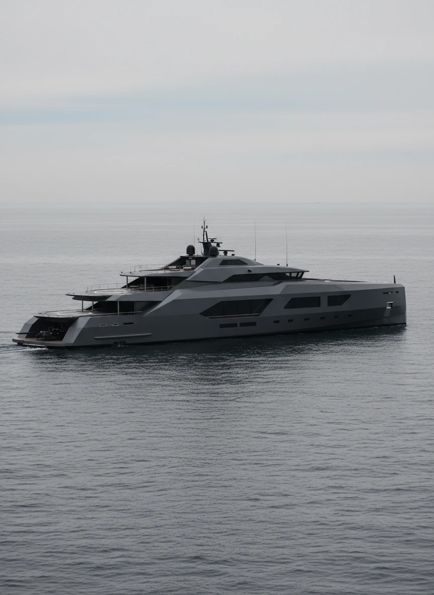 A stealth-inspired military-style yacht concept created using the AI Yacht Generator, blending luxury with tactical design. The hull is matte dark gray with angular surfaces and minimal windows. Calm seas and neutral lighting highlight the imposing silhouette. Stealth design, modern, subdued — NEG: bright colors, decorative ornaments, fantasy weapons, reflection errors, warped geometry, blur, watermark.