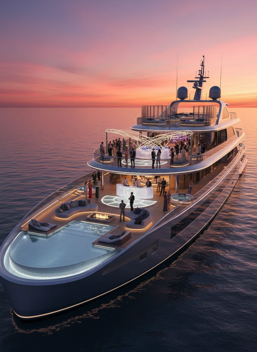 An ultra-opulent party yacht at sunset, rendered by the AI Yacht Generator with emphasis on entertainment spaces. Open decks glow with ambient lighting, an infinity pool spills toward the sea, and the sky fades from orange to purple. The mood is glamorous and celebratory. Sunset lighting, luxury lifestyle, vibrant — NEG: empty lighting rigs, dull colors, uneven symmetry, noisy shadows, extra railings, artifacts, text.