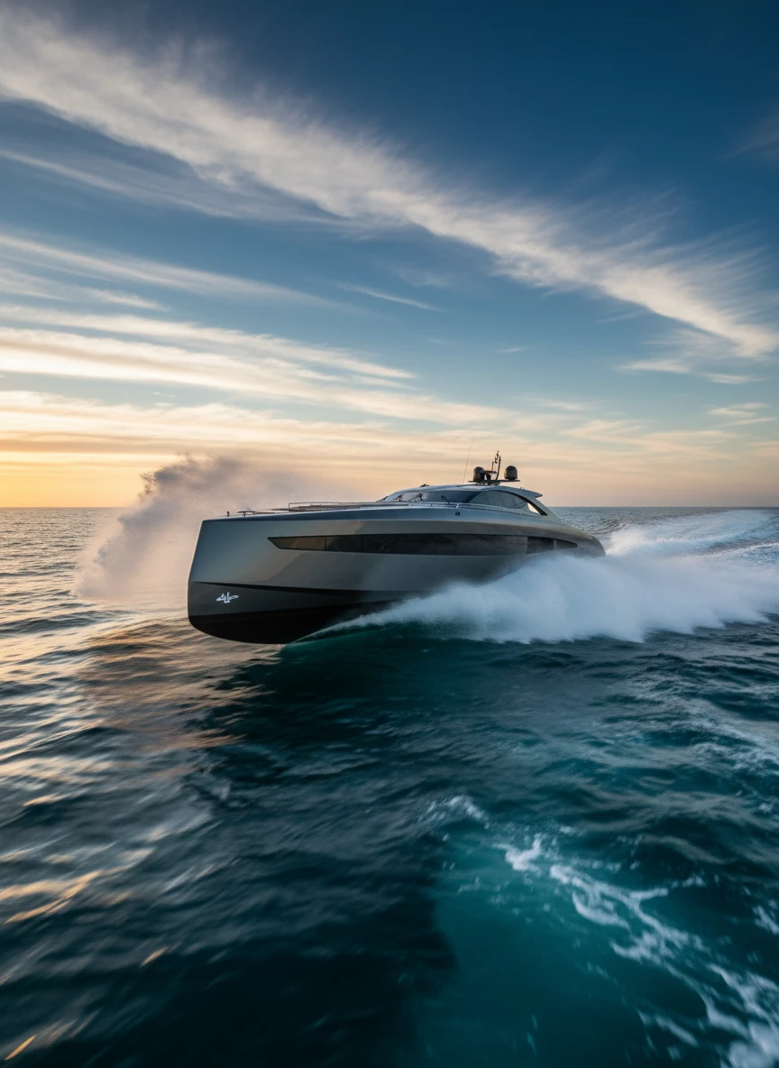 A high-speed sport yacht racing across open ocean, produced by the AI Yacht Generator with emphasis on motion and power. The streamlined hull throws up dramatic water spray as clouds streak across the sky. The camera angle is low and dynamic to enhance speed. Action shot, dynamic, realism — NEG: frozen motion, flat water, incorrect scale, motion blur errors, dull lighting, artifacts, text.