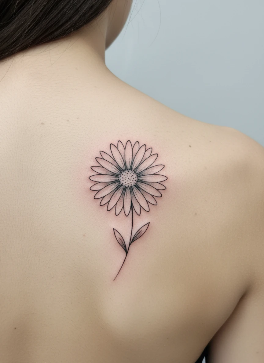 Birth Flower tattoos Generator prompt depicting an April daisy with a clean, minimalist tattoo aesthetic. The daisy is front-facing with evenly spaced petals and subtle shading for depth. Designed to feel light, fresh, and symbolic of innocence. minimal, floral, clean-lines, subtle-shading — NEG: cluttered background, heavy shadows, bold colors, sketchy lines, noise