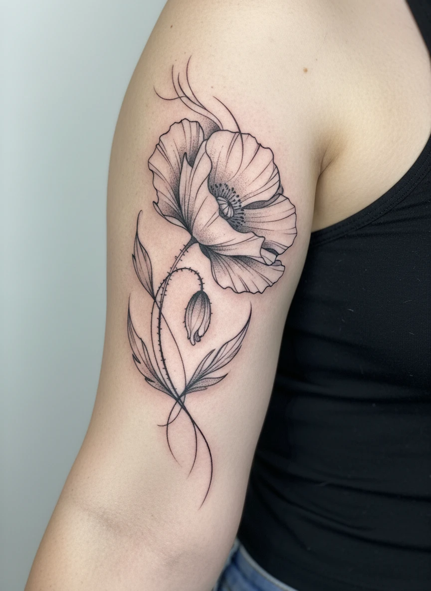 Birth Flower tattoos Generator prompt featuring an August poppy drawn in expressive yet controlled line art. The petals appear slightly windswept, giving motion while preserving clarity. A modern artistic floral tattoo with emotional depth. expressive-linework, modern, floral-art, light-shading — NEG: stiff pose, thick blobs, dull composition, low resolution, symmetry errors