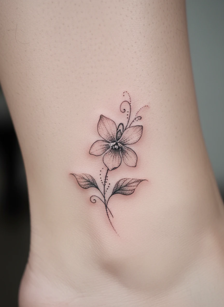 Birth Flower tattoos Generator concept illustrating a February violet as a small-scale micro tattoo. The violet appears gently shaded with light dotwork, creating an elegant and intimate floral symbol. Designed for ankle or behind-the-ear placement with balanced proportions. micro-tattoo, dotwork, delicate, floral — NEG: oversized, harsh contrast, cartoonish, neon colors, rough texture, asymmetry