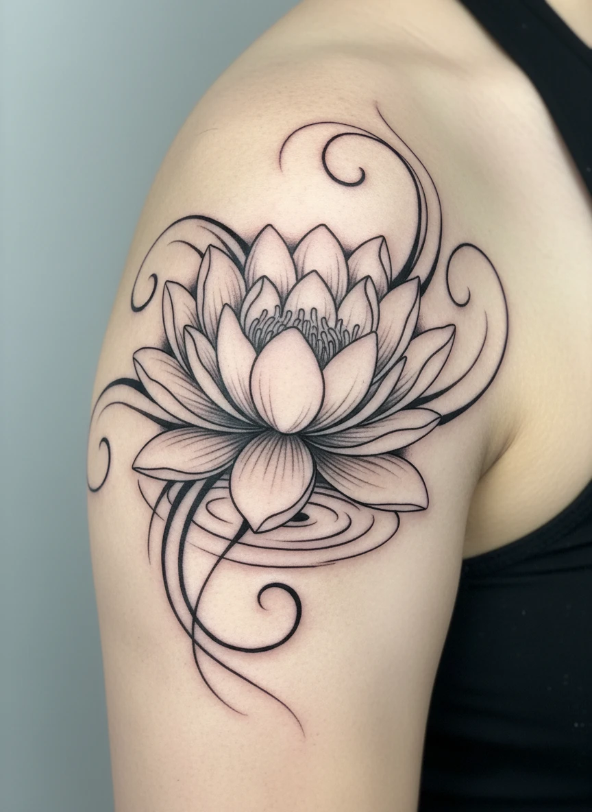 Birth Flower tattoos Generator presenting a July water lily floating composition with smooth flowing ink lines. The petals fan outward gently, creating a serene and balanced visual. Perfect for a shoulder or upper-arm tattoo with calm energy. flowing-lines, serene, botanical-ink, balanced — NEG: chaotic layout, jagged lines, excessive contrast, unrealistic petals, noise